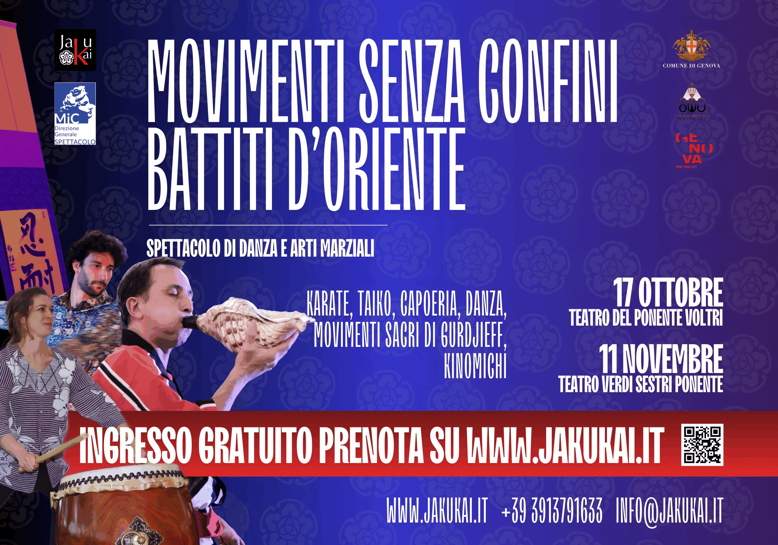 Il 17 ottobre (Teatro delle Ponente – Voltri) e l’11 novembre (Teatro Verdi – Sestri di Ponente), Jakukai presenta due allestimenti complementari dello spettacolo vincitore del bando Periferie del Comune di Genova. Un viaggio tra arti marziali, danza, musica dal vivo e spiritualità in movimento. Con Taiko, Karate, Kinomichi, Capoeira, Danza, Movimenti Sacri di Gurdjieff. Un progetto che intreccia Oriente e Occidente, tradizione e sperimentazione, disciplina e libertà.
